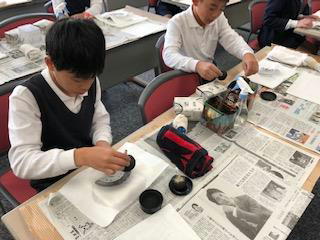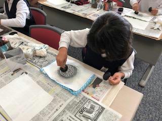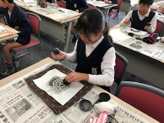 まずはじめは、「拓本」体験。発掘した瓦などの表面の様子を和紙に墨で写し取ります。初めは力加減が分からず、和紙を破いてしまったりしましたが、みんな上手に軒丸瓦の文様を写し取っていました。