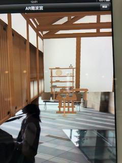 一人一台iPadが配布され、難波宮遺跡の場所に行って、マーカーを読み取ると、iPadに当時の建物の様子などが周りの景色の中に浮かび上がります。iPadを動かすと見える角度も変わります。