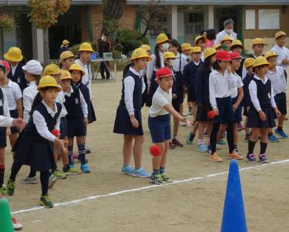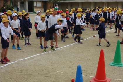 そんなに遠くないように見えますが、実際に狙うと緊張します。それでも、コーンのてっぺんに当てる児童がかなりいました。いいコントロールしています。