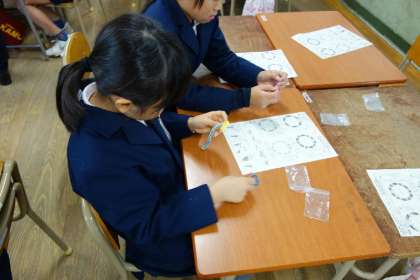 小物作りは色つきのゴムを編んでブレスレットを作りました。みんななかなか器用なので、早くできた人が多かったようです。