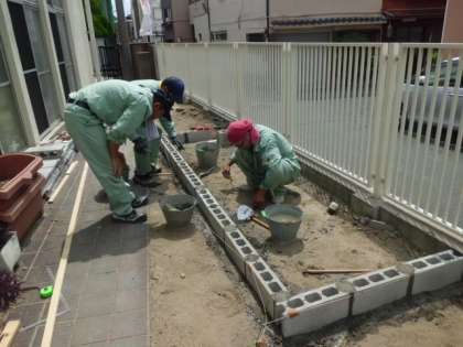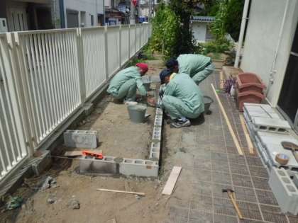 昨日から図書館南のところに6年の学習園を作っていますが、ほとんどできあがりました。区内の管理作業員さんに応援してもらい、ブロックをつみ、セメントを埋め込みました。あとは土を入れ、耕すだけとなりました。2学期からが楽しみです。