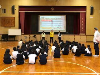 28日午前中は低中高学年別に講堂で交通安全教室を開催しました。