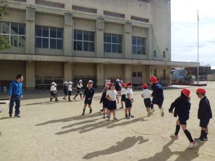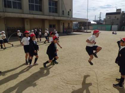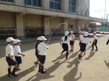 みんなで息を合わせて、大なわ跳びに挑戦です。1回、2回、3回、・・・目指すは150回だそうです。リズム良く、テンポ良く、みんなで数えると気持ちも一つになる気がします。思わず、「がんばれー。」と声がでます。