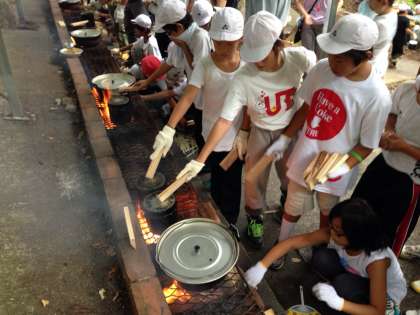 飯盒すいさんを始めます。おいしいカレーをみんなで協力して作ります。おいしく、おいしくなーれ!