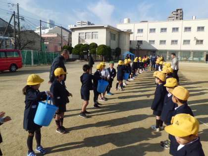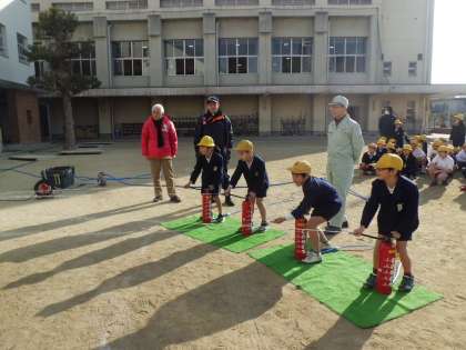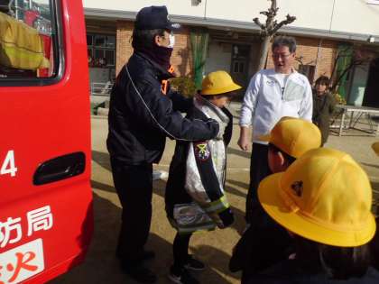 次に、バケツリレー、水消火器、消防車両見学、応急処置体験をそれぞれ行いました。学年ごとに順番に体験していきます。どれも大切な訓練です。みんな真剣にお話を聞き、取り組んでいました。