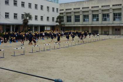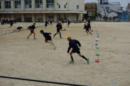 今回は、サッカーのドリブルをして、ハードルを高学年は飛び越え、低学年はくぐって、コーンを回って戻ってくるという班別対抗のリレーです。