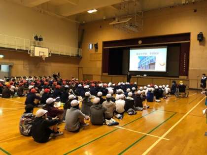 勝山中学校の体育館に4小学校の6年生が集まり、はじめに桃谷中学校の紹介のプレゼンを見せてもらって、続いて吹奏楽部の演奏を聴いて、希望する部活の体験に分かれて参加しました。