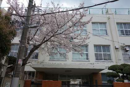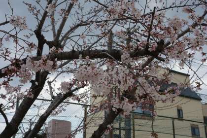正門の前の桜は早くも満開モード。