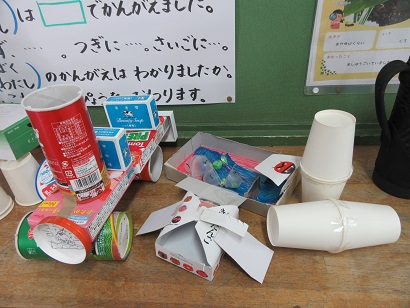 昨日の図画工作科では、箱を使って生き物や乗り物、楽器などをつくりました。