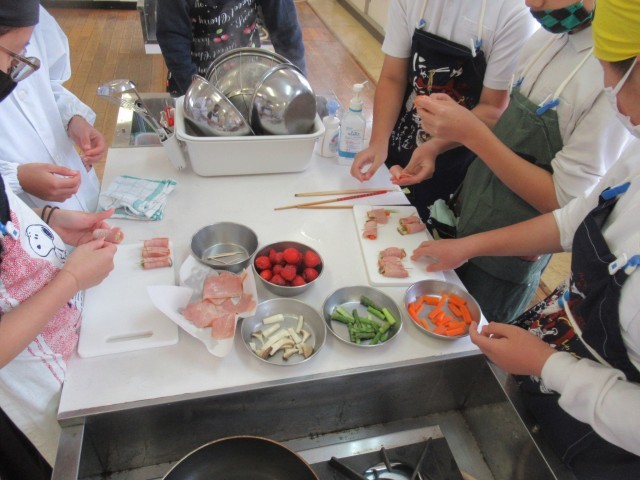 6年生は小学校生活最後の調理実習を行いました。メニューは野菜のベーコン巻でした。どの班も失敗することなく、楽しみながら料理を完成することができました。友だちと役割分担を行い、声を掛け合い、笑顔で手際よく調理を進める姿に大きな成長を感じました。自分たちで作った料理にデザートのいちごをどのように添えるかなど、考えながら盛り付ける姿も微笑ましかったです。みんなの成長と気持ちがこもった、とても素敵な最後の調理実習となりました。
