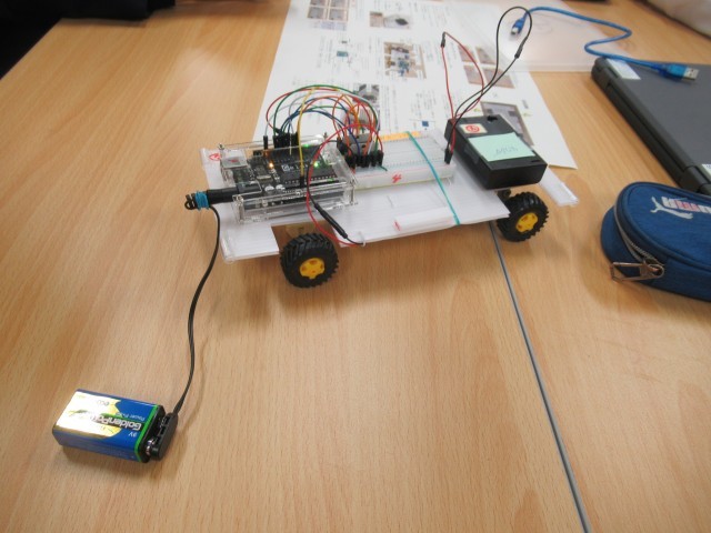 6年生は理科特別授業、「モーターを用いてロボットカーを動かそう」をテーマに講師先生に特別授業をしていただきました。この授業の目的は、「1発光ダイオードを用い、電気と光り方の関係を理解する」「2ワンボードコンピューターを用いたロボットカーの組み立てを通じ、ものづくりの体験をする」「3プログラムのインストールの体験をする」「4ロボットカーを走らせることで、身の回りの電気の応用を体験する」の4つです。LEDの光り方では、実験前に予想を立て、実際に回路を作成し実験しました。回路の作成には少し苦労しましたが、LEDが発光するととても嬉しそうでした。ロボットカーを走らせる学習も、プログラミングから実際に走らせる過程まで、協力しながら楽しんで取り組むことができました。いつも通り講師の先生にお礼の言葉も、立派に伝える事ができました。