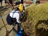 今日は、5年生の田んぼの稲刈りをしました。 稲刈り鎌の使い方を説明した後、3班に...