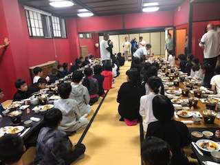 夕食の時間です。食事係が先に集まって打ち合わせ中です。