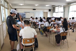 ・給食は前を向いて、しゃべらずに静かに食べます。また、担任もエプロン、マスク、三角巾などをつけています。
