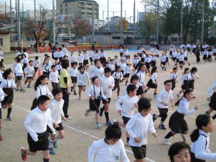 朝の学習の時間に全校で音楽に合わせて運動場を走ります。