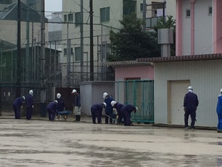 側溝や会所の砂や土を取り除く作業をして貰ってます。35人の作業員の皆さんで雨の中、管理作業員と一緒に頑張ってくれています。ありがとうございます。