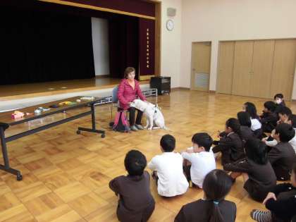 ゲストティーチャーの方の生活の様子や、盲導犬の仕事の様子など、たくさんお話をしてもらいました。初めて知ることだらけの子どもたちは、とても静かに、真剣に話を聞いていました。ハーネスをはずした盲導犬と触れ合ったり、点字のついた道具を見せてもらったりもしました。