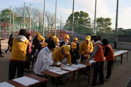 朝、子どもたちは保護者の方と一緒に自分の地区の一次避難場所になっている場所に集合し、避難場所である学校へ見守り隊の方などと一緒に登校しました。