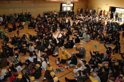 受付をしたあと、講堂に入り、地域で集まって座りました。子どもたちだけだと余裕がある講堂も、保護者・地域の方を含めると結構ぎゅうぎゅうです。もしほんとに避難所になったらもっと多くの人と物で大変なことになるなあと感じました。もしそうなったらみんなで譲り合わないといけませんね。