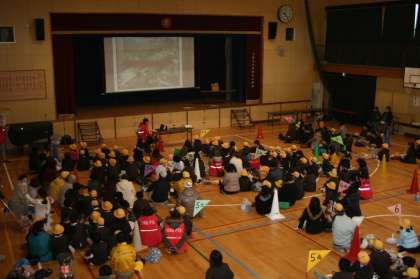 関係者のあいさつのあと、区役所の防災担当の方からスライドや映像を交えて地震の話を聞きました。地震の時の実際の映像や実験映像を見て、子どもたちはとても驚き、地震の怖さを感じていました。