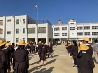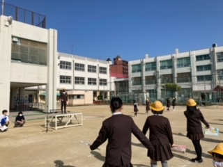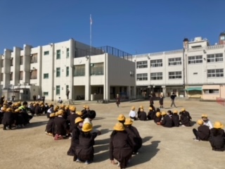 今朝は、6年生がいる最後の全校集会でした。青空のもとみんなで楽しかったです。