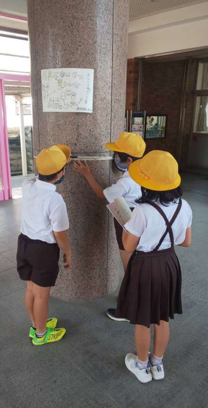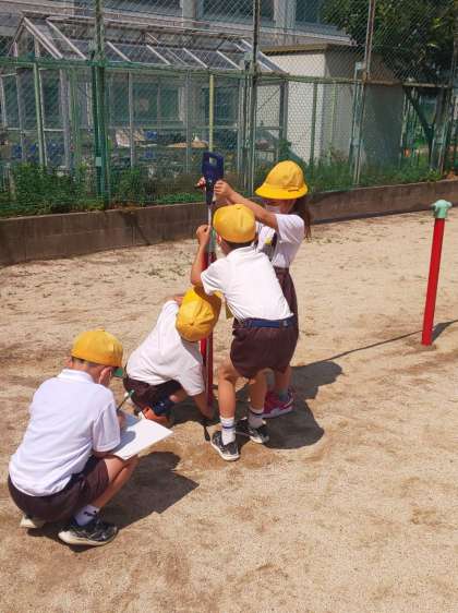 巻尺を使って、教室の縦や横の長さ、鉄棒の高さ、柱の周りの長さなどを測りました。班で協力して活動できました。