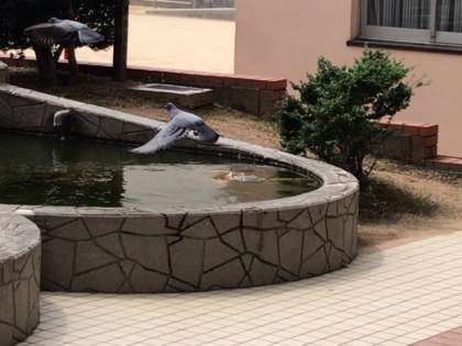 池に水を飲みにきた鳩が飛び立ちました。