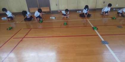 ゴムの引っ張る長さや本数を変えて、車の走る距離を調べました。その後、遠くまで走るように工夫をし、みんなで競い合いました。