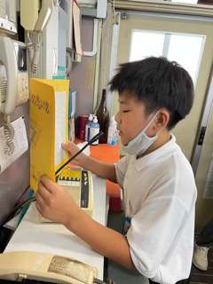 7月19日、無事に1学期の終業式が行われました。当初は感染症対策のため運動場での式を予定していましたが、5時間目に実施ということもあり、熱中症対策のために放送での終業式に変更しました。画像は1学期の思い出を5,6年生の代表児童に発表してもらった様子です。