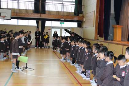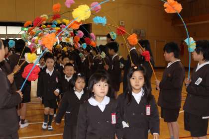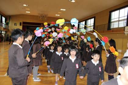 花のアーチをくぐってかわいい1年生が入場し、みんなの前で「東中川小の1年生になりました。よろしくお願いします!」と講堂中響く元気な声であいさつできました。
