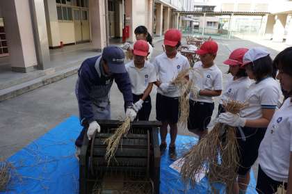 なかなかコツがいりましたが、穂から実がこそぎ落とされる様子に子どもたちは「すごい!!」と大はしゃぎ。「もうこれ食べられるの?」と自分たちが育てた米を食べるのを今からとても楽しみにしています。