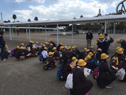 朝8時に学校を出発した6年生52名は、昼12時、スペイン村に到着しました。お天気は晴れ。今から中に入ってお昼ご飯を食べたり、遊んだりします。みんな元気です。