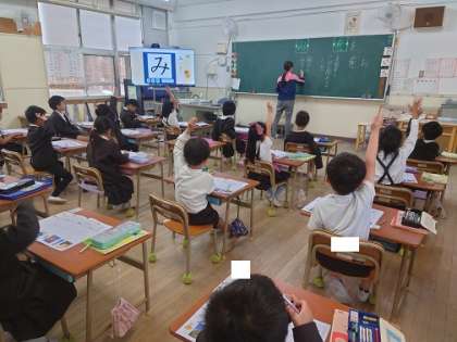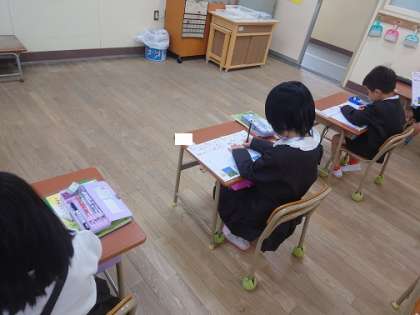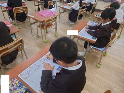 ひらがなの学習をしています。今日は「み」と「を」の学習です。姿勢に気をつけて丁寧に書いていました。