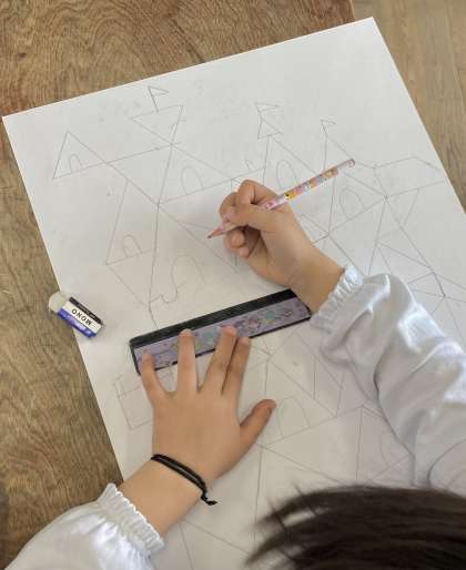 三角形をつないでお城を作っていきました。
