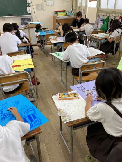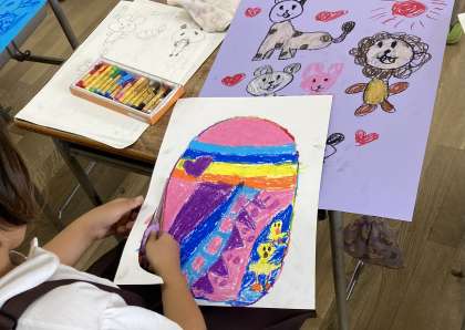 不思議な卵と、そこから飛び出す動物を思い思いに描きました。