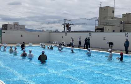 長そで、長ズボン、靴を履き、お腹にペットボトルを抱えて、浮く感覚を体感しました。