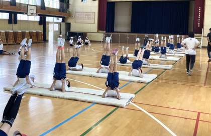 今日はしっかりウォーミングアップをした後、倒立前転をしました。