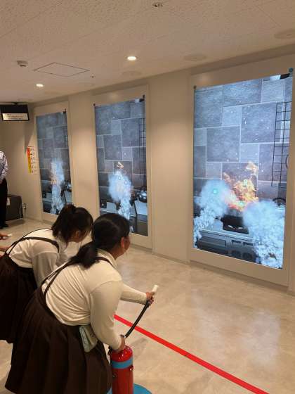 初期消火を体験しています。