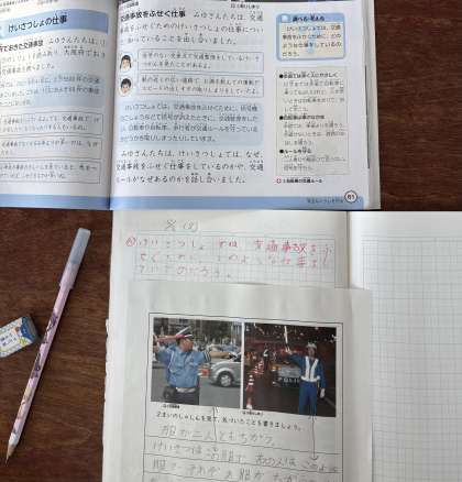 「警察署では交通事故を防ぐためにどのようなお仕事をしているのか」みんなで考えました。