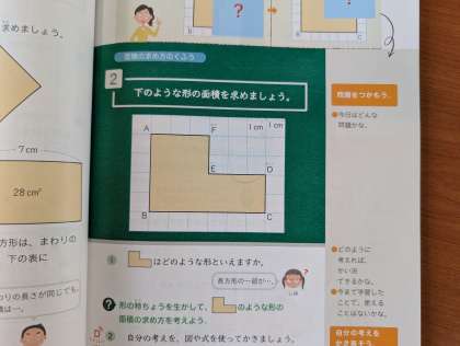 面積の求め方について学習しています。今日は、L字型の図形の面積の求め方を考えました。