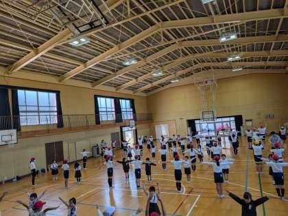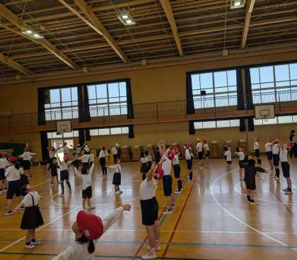 1年生と6年生が一緒にラジオ体操をしました。6年生が声をかけながら丁寧に教える姿が見られました。1年生も素直に聞いて取り組んでいました。