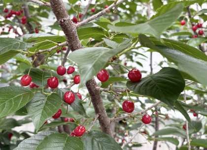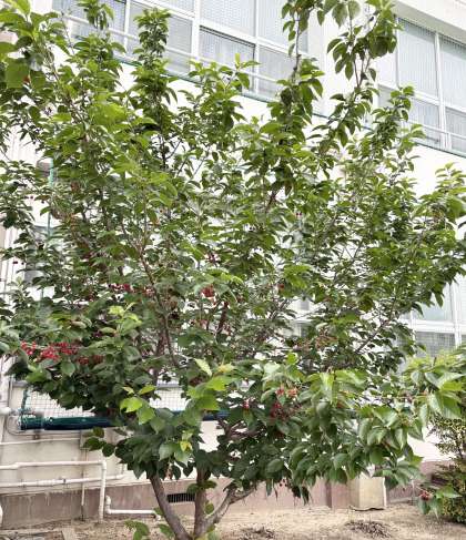 管理作業員さんが冬の間もたくさんお世話をして下さったサクランボの木に、赤い実がたくさん実りました。