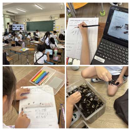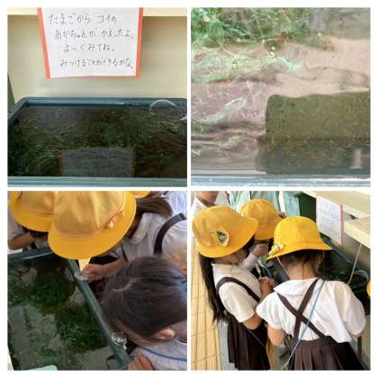 管理作業員さんが孵して下さったコイの赤ちゃんや、カブトムシ、ダンゴムシなどをよく観察して、『生きものしょうかいカード』を書きました。