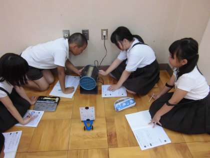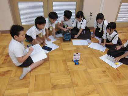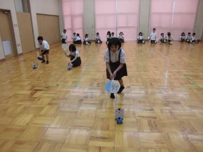 「風とゴムの力のはたらき」の学習で、風で動く車をつくって動かしたり、「風の強さと車が動くきょり」を調べたりしました。