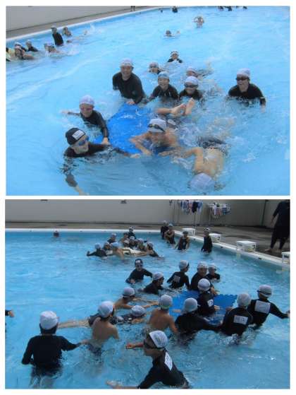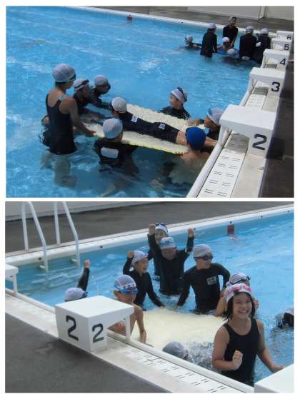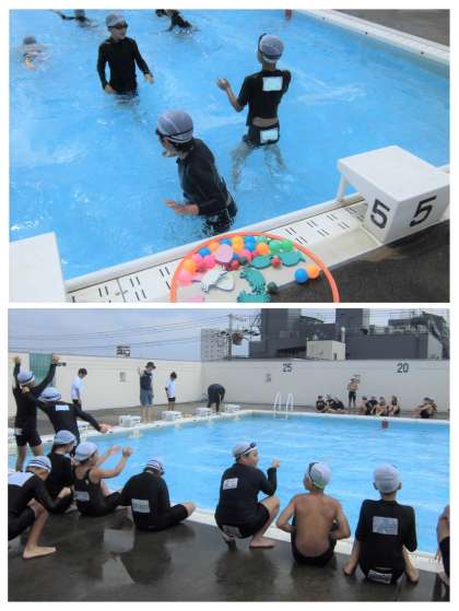 平泳ぎの練習をした後は、クラス対抗で「人間運びゲーム」や「宝探しゲーム」を行いました。1学期最後のプールを、友だちと協力して楽しく終えることができました。