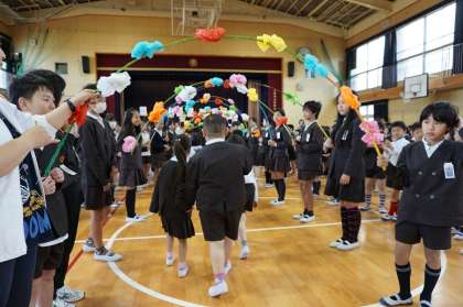 1年生は花のアーチに迎えられながら、恥ずかしそうに入場していました。