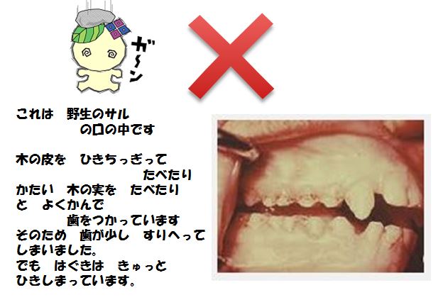 下の写真は 動物園のサル と 野生のサル の口の中です。