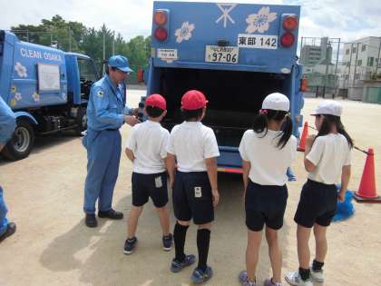 5月26日(木)、4年生はパッカー車体験を行いました。東部環境事業センターから2台のパッカー車と職員の方に来ていただきました。