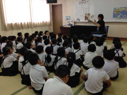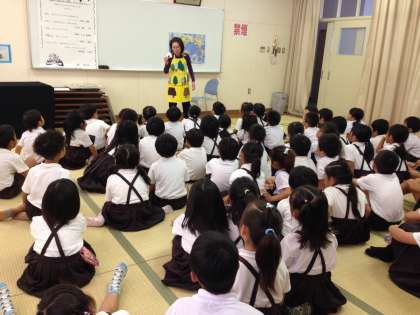 語り手が「コカのカメ♪コカのカメ♪」と歌うと、子どもたちは楽しそうに「かたい かたい こうら♪かたい かたい こうら♪」と続きを歌い、どんどんお話の世界に引き込まれていく様子が見られました。