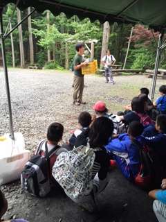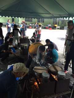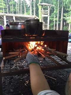 みんなで協力して、まき、割り箸、新聞紙だけで火をつけて、鴨鍋を作ります。